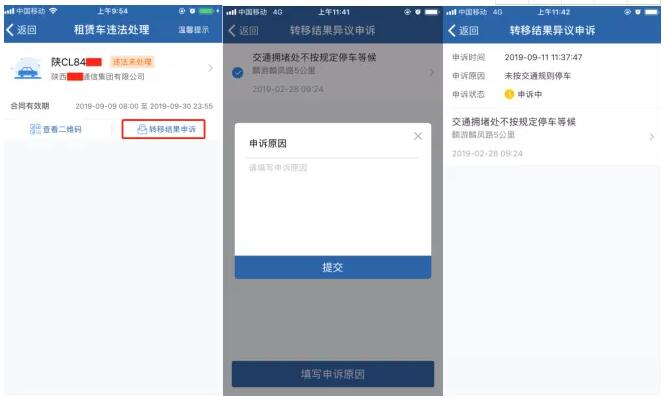 承租駕駛?cè)它c擊【租賃車違法處理】功能,選擇【轉(zhuǎn)移結(jié)果申訴】按鈕進(jìn)入申訴界面。選擇申訴的交通違法行為,采集申訴原因,提交申訴。
